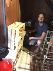 The photos seen here are of my boyfriend Matt filling the containers in the kitchen. We had to sanitize a pitcher to get the water in, which was inefficient. We’re considering getting a hose attachment. Matt puts the containers with our food storage, camping supplies, twin buckets, and my NET gear, under our basement stairs. The wine rack is also part of the emergency supplies 🙂