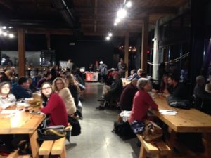 People sitting at benches in a large indoor room participating in Trivia Night.